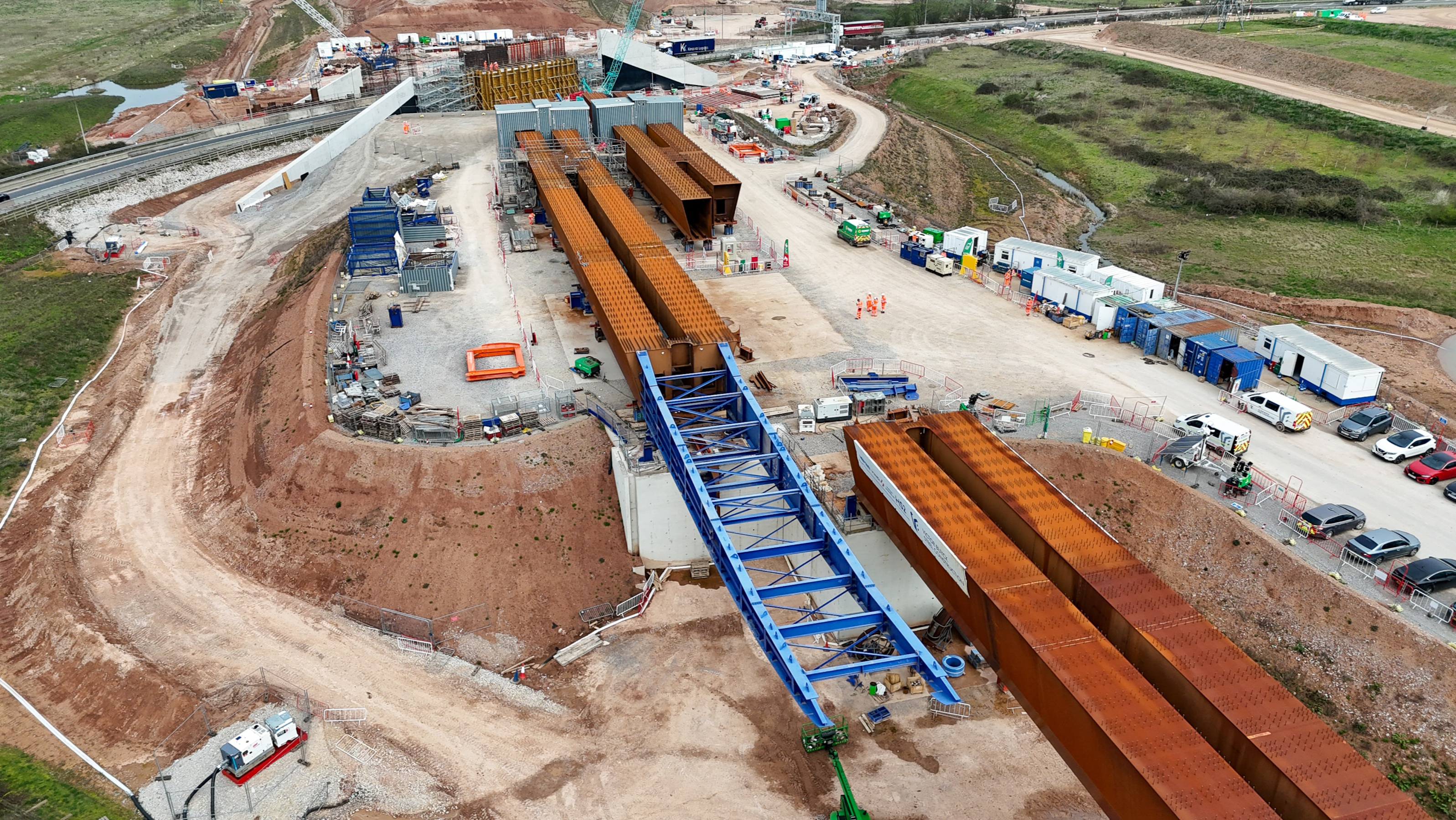 The west deck of the M6 South viaduct, which will carry high speed trains towards Birmingham, is being assembled in four sections. The first 107 metre section will be slid over the M6 junction 4 southbound slip road on 11th April 2026.
